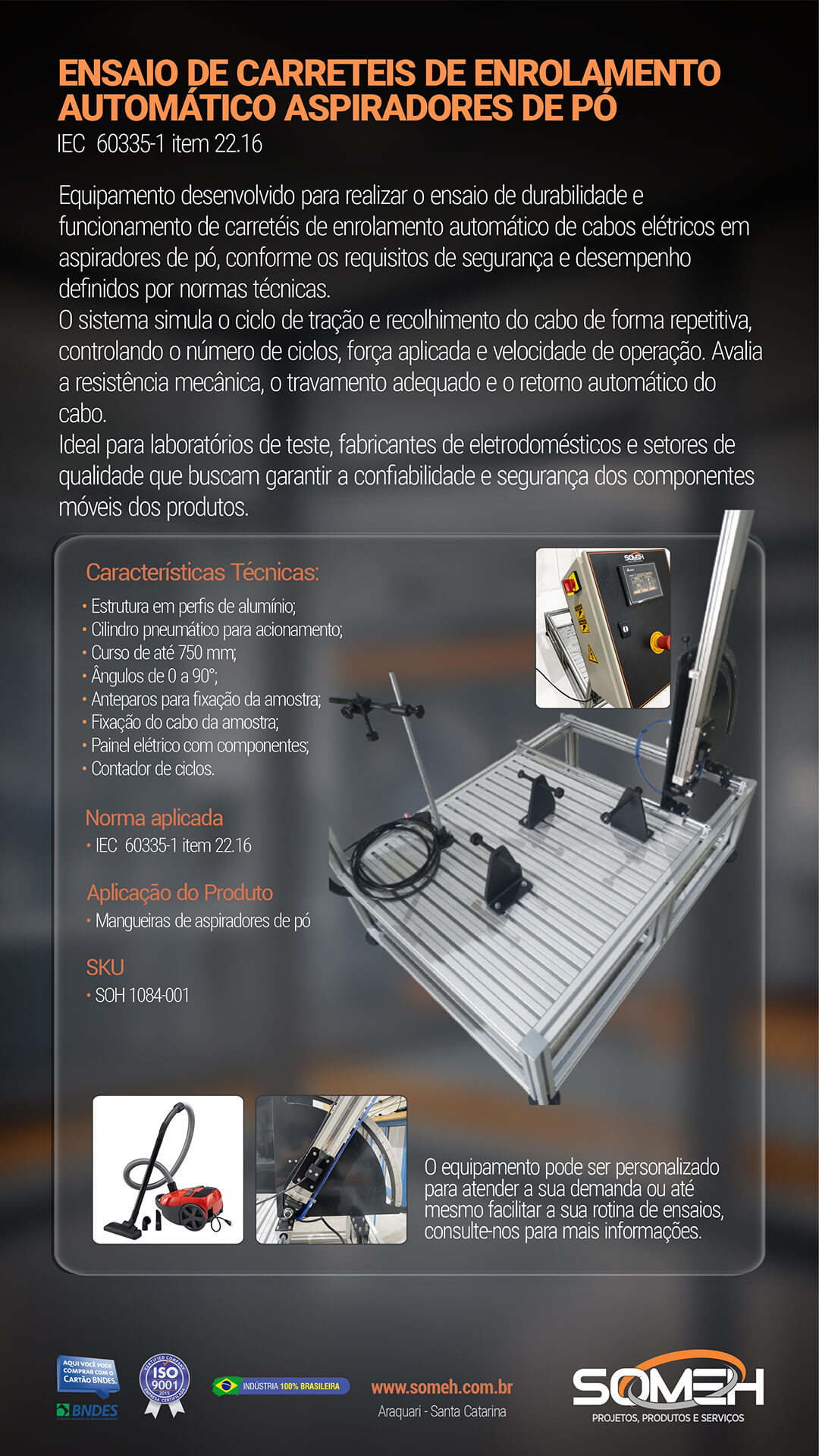 Equipamento desenvolvido para realizar o ensaio de durabilidade e funcionamento de carretéis de enrolamento automático de cabos elétricos em aspiradores de pó, conforme os requisitos de segurança e desempenho definidos por normas técnicas. O sistema simula o ciclo de tração e recolhimento do cabo de forma repetitiva, controlando o número de ciclos, a força aplicada e a velocidade de operação. O ensaio avalia a resistência mecânica, o travamento adequado e o retorno automático do cabo, sendo indicado para laboratórios de teste, fabricantes de eletrodomésticos e setores de qualidade que buscam garantir a confiabilidade e segurança dos componentes móveis dos produtos.